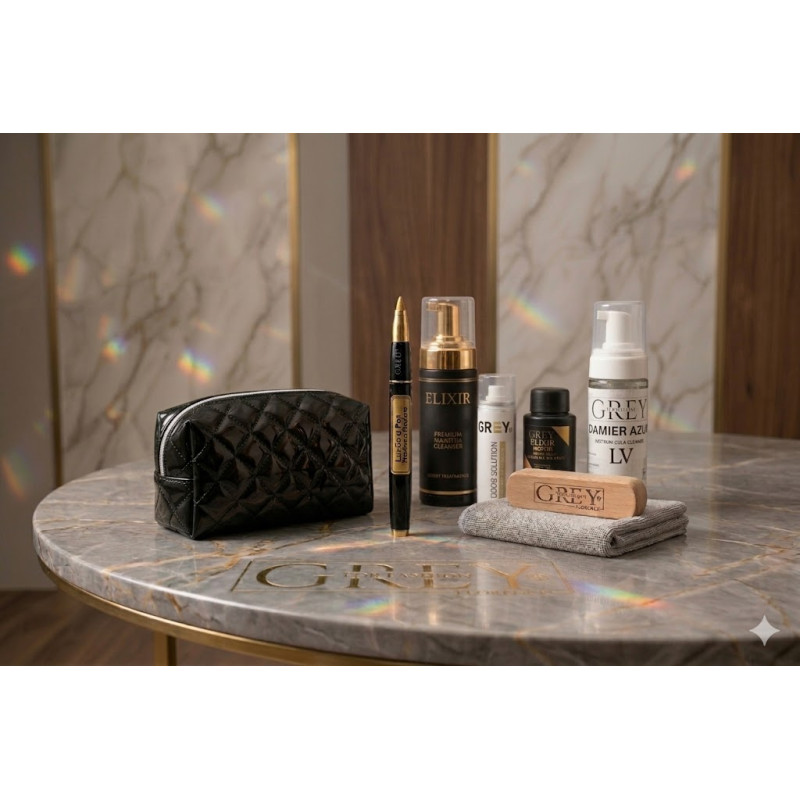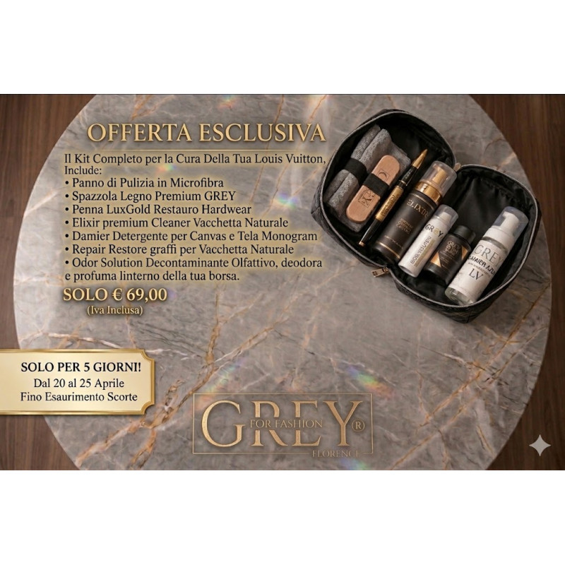 Sottotitolo (Body Copy): Prenditi cura del tuo lusso con i prodotti professionali GREY For Fashion. Tutto ciò di cui hai bisogno per rigenerare vacchetta, canvas e hardware in un unico set esclusivo.
